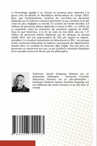La Muntulogie appelle à un Ubuntu et soutenue pour répondre à la grave crise de Bisoïté en République démocratique du Congo (RDC) alors que l'individualisme continue de s'accroître. Les personnes déplacées par la violence subissent gravement ce qui constitue l'une des crises les plus négligées au monde. En octobre de l'année dernière, 6,9 millions de personnes étaient déplacées à travers la RDC, un chiffre qui va augmenter selon les prévisions des prochains rapports de l'ONU. Dans le seul Nord-Kivu, à la fin du mois de mai 2024, plus de 1,77 million de personnes étaient déplacées par les attaques du groupe rebelle M23, soit une augmentation de 16 % par rapport au rapport précédent. La situation humanitaire est désastreuse en RDC. Les groupes armés continuent d'exacerber la violence, provoquant des déplacements massifs dans un contexte du Bumuntu déjà fragile. Tous les jours les personnes se massacrent eux eux, ce qui justifie la nécessité d'adoption de la nouvelle science du Muntu par les philosophes.