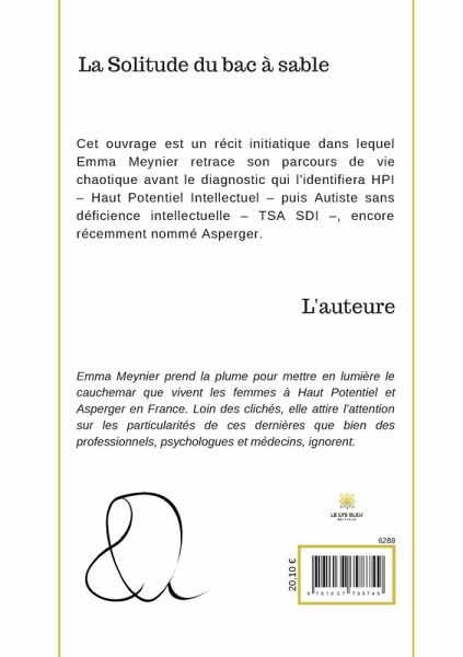 Cet ouvrage est un récit initiatique dans lequel Emma Meynier retrace son parcours de vie chaotique avant le diagnostic qui l'identifiera HPI - Haut Potentiel Intellectuel - puis Autiste sans déficience intellectuelle - TSA SDI -, encore récemment nommé Asperger.