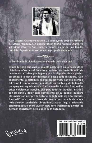 La Sombra de la dictadura es una novela de la vida real. Es una historia que vivió el pueblo paraguayo en la época de la dictadura, años de sufrimiento y de dolor, un buen día salió de la sombra a luchar por la paz y por la dignidad de su pueblo así empezó la lucha por derrocar al despiadado dictadura. Juan experimento la dictadura con su propia vida, por eso escribió tal como lo sintió los sufrimiento de su pueblo y de la familia paraguaya en aquella época. Fueron crueles los días, fueron días grises y dolorosos aquellos días para todos los pueblos. Escribió con su puño y dolor cada sufrimiento de su pueblo, quedara plasmada por siempre la historia de la familia de esta historia. Juan salió de su país en busca de nuevos horizonte, la dictadura no le dio oportunidad de sobresalir en nada así llego a la tierra de oportunidades y ahora vive en New York tratando de olvidar los tiempos sangrientos de la época de la dictadura.