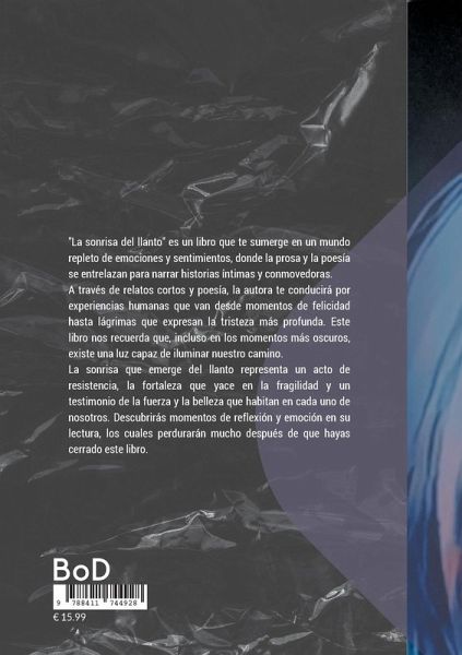 "La sonrisa del llanto" es un libro que te sumerge en un mundo repleto de emociones y sentimientos, donde la prosa y la poesía se entrelazan para narrar historias íntimas y conmovedoras. A través de relatos cortos y poesía, la autora te conducirá por experiencias humanas que van desde momentos de felicidad hasta lágrimas que expresan la tristeza más profunda. Este libro nos recuerda que, incluso en los momentos más oscuros, existe una luz capaz de iluminar nuestro camino. La sonrisa que emerge del llanto representa un acto de resistencia, la fortaleza que yace en la fragilidad y un testimonio de la fuerza y la belleza que habitan en cada uno de nosotros. Descubrirás momentos de reflexión y emoción en su lectura, los cuales perdurarán mucho después de que hayas cerrado este libro.