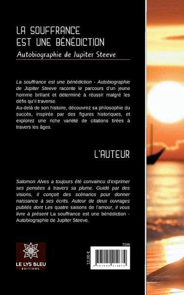 La souffrance est une bénédiction - Autobiographie de Jupiter Steeve raconte le parcours d'un jeune homme brillant et déterminé à réussir malgré les défis qüil traverse. Au-delà de son histoire, découvrez sa philosophie du succès, inspirée par des figures historiques, et explorez une riche variété de citations tirées à travers les âges.