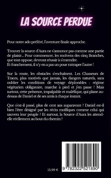 Pour notre ado préféré, l'aventure finale approche.Trouver la source d'Aura ne s'annonce pas comme une partie de plaisir... Pour commencer, les molvens des cinq Branches, que tout oppose, devront réussir à s'entendre.Et franchement, il n'y en a pas un pour rattraper l'autre!Sur la route, les obstacles s'enchaînent. Les Chasseurs de Traces, plus motivés que jamais, les dangers naturels, sans oublier les conditions de voyage déplorables : régime végétarien obligatoire, marche à pied et j'en passe! Mais surtout, cette présence, impalpable et maléfique, qui plane au-dessus de Daniel et de ses amis à chaque instant.Que s'est-il passé, plus de cent ans auparavant? Daniel est-il bien l'être désigné par les récits molfiques comme celui qui sauvera leur peuple? Et surtout, la source d'Aura les attend-elle réellement au bout du chemin?