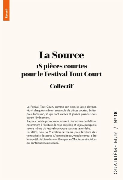 Le Festival Tout Court, comme son nom le laisse deviner, réuni chaque année un ensemble de pièces courtes, écrites pour l'occasion, et qui sont créées et jouées plusieurs fois durant l'événement. Il a pour but de promouvoir le talent des artistes de théâtre, notamment à l'écriture, la mise en scène et le jeu, puisque la nature même du festival convoque tous ces savoir-faire. En 2025, pour sa 3e édition, le thème pour l'écriture des textes était '¿la source¿'. Vaste sujet qui, vous le verrez, a été interprété de bien des manières par les 21 auteurs et autrices qui contribuent à ce recueil.