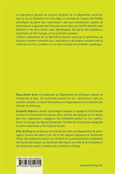 Klaus-Dieter Ertler est professeur au Département de philologie romane de l¿Université de Graz. Ses recherches portent sur les « spectateurs » dans les cultures romanes, le roman francophone et hispanophone et les relations des Jésuites en Amérique. Elisabeth Hobisch a étudié la philologie française et espagnole à l¿Université de Graz et à l¿Université de Cáceres. Elle a terminé son doctorat sur les lettres dans les « spectateurs » espagnols. Ses recherches portent sur les « spectateurs » en Europe, les Digital Humanities, l¿histoire de la littérature espagnole et latino-américaine et les Cultural Studies. Ellen Krefting est professeur en histoire des idées au Département de philosophie, histoire des idées et de l¿art et des langues classiques de l¿Université d¿Oslo. Ses recherches portent sur l¿histoire de la communication notamment des feuilles périodiques au Danemark-Norvège et sur celle de la circulation et des formes de savoirs à l¿époque des Lumières en Europe