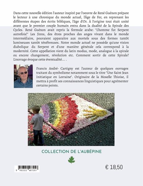 Dans cette nouvelle édition, en reprenant les différentes étapes des écrits bibliques, l'âge d'Or, l'auteur inspiré par l'oeuvre de René Guénon prépare le lecteur à une chronique du monde actuel, l'Âge de Fer. À l'origine tout n'étant qu'unité avant que le premier couple humain entra dans la dualité de la Spirale des Cycles. René Guénon avait repris la formule arabe :"L'homme fut Serpent autrefois! Les Jinns, des êtes proches des anges, vivant dans le monde intermédiaire pouvant apparaitre aux mortels sous des formes tantôt lumineuses, tantôt ténébreuses. Notre monde actuel ne possède qu'une vision diabolique du Serpent et d'une manière générale cela correspond à la modernité. Cette appellation vient du latin modus, mode comme la spirale ou encore changement, révolution. Comment sortir de cette Spirale ? L'ouvrage évoque cette éventualité.Francis André-Cartigny est l'auteur de quelques ouvrages traitant du symbolisme notamment sous le titre "Une Saint Initiatique en Lorraine". Originaire de la Moselle Thioise, il mettra à profit ses connaissances linguistiques pour agrémenter certains points.