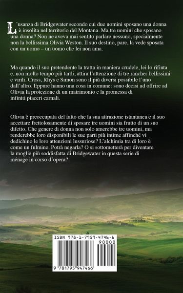 L’usanza di Bridgewater secondo cui due uomini sposano una donna è insolita nel territorio del Montana. Ma tre uomini che sposano una donna? Non ne aveva mai sentito parlare nessuno, specialmente non la bellissima Olivia Weston. Il suo destino, pare, la vede sposata con un uomo – un uomo che lei non ama. Ma quando il suo pretendente la tratta in maniera crudele, lei lo rifiuta e, non molto tempo più tardi, attira l’attenzione di tre rancher bellissimi e virili. Cross, Rhys e Simon sono il più diversi possibile l’uno dall’altro. Eppure hanno una cosa in comune: sono decisi ad offrire ad Olivia la protezione di un matrimonio e la promessa di infiniti piaceri carnali. Olivia è preoccupata del fatto che la sua attrazione istantanea e il suo accettare frettolosamente di sposare tre uomini sia frutto di un suo difetto. Che genere di donna non solo amerebbe tre uomini, ma renderebbe loro disponibili le sue parti più intime affinché vi dedichino le loro attenzioni lussuriose? L’alchimia tra di loro è come un fulmine. Potrà negarla? O si sottometterà per diventare la moglie più soddisfatta di Bridgewater in questa serie di ménage in corso d’opera?
