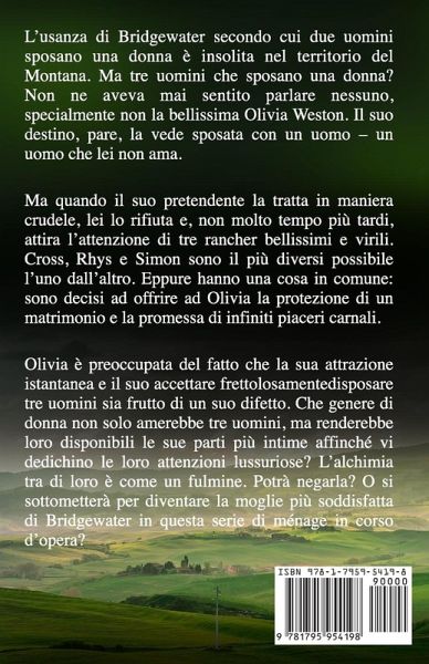 L’usanza di Bridgewater secondo cui due uomini sposano una donna è insolita nel territorio del Montana. Ma tre uomini che sposano una donna? Non ne aveva mai sentito parlare nessuno, specialmente non la bellissima Olivia Weston. Il suo destino, pare, la vede sposata con un uomo – un uomo che lei non ama. Ma quando il suo pretendente la tratta in maniera crudele, lei lo rifiuta e, non molto tempo più tardi, attira l’attenzione di tre rancher bellissimi e virili. Cross, Rhys e Simon sono il più diversi possibile l’uno dall’altro. Eppure hanno una cosa in comune: sono decisi ad offrire ad Olivia la protezione di un matrimonio e la promessa di infiniti piaceri carnali. Olivia è preoccupata del fatto che la sua attrazione istantanea e il suo accettare frettolosamente di sposare tre uomini sia frutto di un suo difetto. Che genere di donna non solo amerebbe tre uomini, ma renderebbe loro disponibili le sue parti più intime affinché vi dedichino le loro attenzioni lussuriose? L’alchimia tra di loro è come un fulmine. Potrà negarla? O si sottometterà per diventare la moglie più soddisfatta di Bridgewater in questa serie di ménage in corso d’opera?
