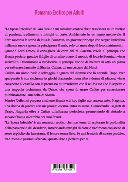 "La Sposa Infedele" di Lara Steele è un romanzo erotico che ti trascinerà in un vortice di passione, tradimento e intrighi di corte. Ambientato in un regno medievale, il libro racconta la storia di Jous-le-Fountain, un giovane principe che scopre l'infedeltà della sua nuova sposa, la principessa Shania, solo un mese dopo il loro matrimonio.Quando Lord Draco, il consigliere di corte del re Gawain, rivela al principe che Shania porta in grembo il figlio di un altro uomo, il mondo di Jous-le-Fountain viene sconvolto. Determinato a vendicarsi, il principe decide di mettere in atto un piano per catturare l'amante di Shania, Cullen, un mercenario del Nord.Cullen, un uomo rude e selvaggio, è ignaro del destino che lo attende. Dopo aver sperperato le sue ricchezze in giochi d'azzardo, buon cibo e donne di piacere, viene convocato al castello con la promessa di un'udienza con il re. Ma ciò che lo aspetta è una trappola orchestrata da Draco, che spera di usare Cullen per smascherare pubblicamente l'infedeltà di Shania.Mentre Cullen si prepara a salvare Shania e il loro figlio non ancora nato, Nagynia, una donna di piacere con un passato oscuro, entra in scena. Conoscendo i segreti di Draco, Nagynia offre a Cullen un'alleanza pericolosa, promettendo di aiutarlo a salvare Shania in cambio dei suoi favori."La Sposa Infedele" è un romanzo erotico che non teme di esplorare le profondità della passione e del desiderio, intrecciando intrighi di corte e tradimenti con scene di sesso esplicito che lasceranno il lettore senza fiato. Se ami le storie di amore proibito, tradimenti e passioni sfrenate, questo libro è perfetto per te.