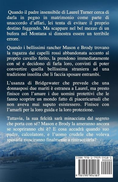 Bestseller USA Today! Quando il padre insensibile di Laurel Turner cerca di darla in pegno in matrimonio come parte di un accordo d’affari, lei tenta di evitare il proprio destino fuggendo. Ma scappare nel bel mezzo di una bufera nel Montana si dimostra essere un terribile errore. Quando i bellissimi rancher Mason e Brody trovano la ragazza dai capelli rossi abbandonata accanto al proprio cavallo ferito, la prendono immediatamente con sé e decidono di farla loro, convinti di poter convertire quella bellissima straniera ad una tradizione insolita che li faccia sposare entrambi. L’usanza di Bridgewater che prevede che una donna sposi due mariti è estranea a Laurel, ma presto finisce con l’amare i due uomini protettivi che le fanno scoprire un mondo fatto di piaceri carnali che non aveva mai saputo esistessero. Finisce con l’amarli per la loro guida e la loro protezione. Tuttavia, la sua felcità sarà minacciata dal segreto che porta con sé? Mason e Brody la ameranno ancora se scopriranno chi è? E cosa accadrà quando suo padre, calcolatore, e l’uomo crudele che voleva sposarla riusciranno finalmente a rintracciarla?