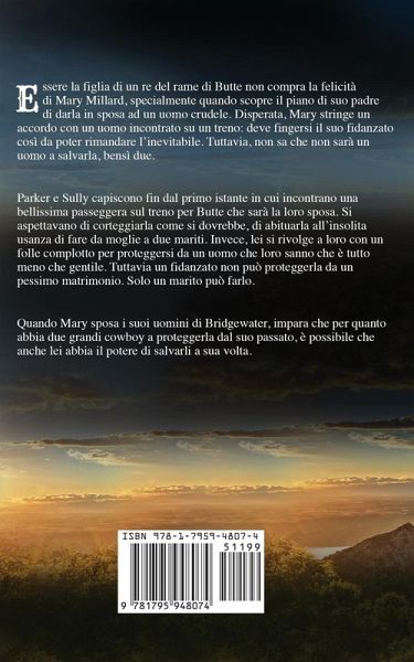 Essere la figlia di un re del rame di Butte non compra la felicità di Mary Millard, specialmente quando scopre il piano di suo padre di darla in sposa ad un uomo crudele. Disperata, Mary stringe un accordo con un uomo incontrato su un treno: deve fingersi il suo fidanzato così da poter rimandare l’inevitabile. Tuttavia, non sa che non sarà un uomo a salvarla, bensì due. Parker e Sully capiscono fin dal primo istante in cui incontrano una bellissima passeggera sul treno per Butte che sarà la loro sposa. Si aspettavano di corteggiarla come si dovrebbe, di abituarla all’insolita usanza di fare da moglie a due mariti. Invece, lei si rivolge a loro con un folle complotto per proteggersi da un uomo che loro sanno che è tutto meno che gentile. Tuttavia un fidanzato non può proteggerla da un pessimo matrimonio. Solo un marito può farlo. Quando Mary sposa i suoi uomini di Bridgewater, impara che per quanto abbia due grandi cowboy a proteggerla dal suo passato, è possibile che anche lei abbia il potere di salvarli a sua volta.