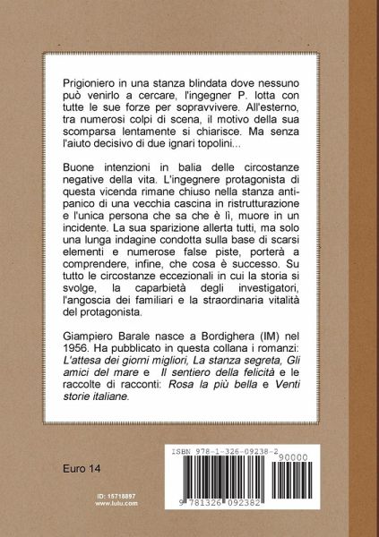 Prigioniero dentro una stanza blindata dove nessuno può venirlo a cercare, l'ingegner P. lotta con tutte le sue forze per sopravvivere. All'esterno, tra numerosi colpi di scena, il motivo della sua scomparsa lentamente si chiarisce. Ma senza l'aiuto decisivo di due ignari topolini... Buone intenzioni in balia delle circostanze negative della vita. L'ingegnere protagonista di questa vicenda rimane chiuso nella stanza anti-panico di una vecchia cascina in ristrutturazione. L'unica persona che sa che è lì, muore in un incidente. La sua scomparsa allerta tutti, ma solo una lunga indagine condotta sulla base di scarsi elementi e numerose false piste, porterà a capire che è successo. Su tutto le circostanze eccezionali in cui la storia si svolge, la caparbietà degli investigatori, l'angoscia dei familiari e la straordinaria vitalità del protagonista.