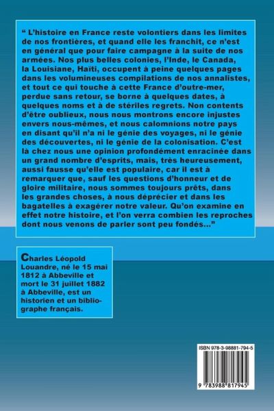 " L'histoire en France reste volontiers dans les limites de nos frontières, et quand elle les franchit, ce n'est en général que pour faire campagne à la suite de nos armées. Nos plus belles colonies, l'Inde, le Canada, la Louisiane, Haïti, occupent à peine quelques pages dans les volumineuses compilations de nos annalistes, et tout ce qui touche à cette France d'outre-mer, perdue sans retour, se borne à quelques dates, à quelques noms et à de stériles regrets. Non contents d'être oublieux, nous nous montrons encore injustes envers nous-mêmes, et nous calomnions notre pays en disant qu'il n'a ni le génie des voyages, ni le génie des découvertes, ni le génie de la colonisation. C'est là chez nous une opinion profondément enracinée dans un grand nombre d'esprits, mais, très heureusement, aussi fausse qu'elle est populaire, car il est à remarquer que, sauf les questions d'honneur et de gloire militaire, nous sommes toujours prêts, dans les grandes choses, à nous déprécier et dans les bagatelles à exagérer notre valeur. Qu'on examine en effet notre histoire, et l'on verra combien les reproches dont nous venons de parler sont peu fondés..."