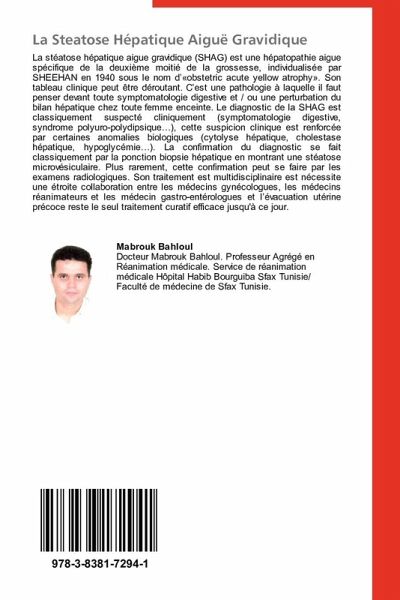 La stéatose hépatique aigue gravidique (SHAG) est une hépatopathie aigue spécifique de la deuxième moitié de la grossesse, individualisée par SHEEHAN en 1940 sous le nom d "obstetric acute yellow atrophy". Son tableau clinique peut être déroutant. C est une pathologie à laquelle il faut penser devant toute symptomatologie digestive et / ou une perturbation du bilan hépatique chez toute femme enceinte. Le diagnostic de la SHAG est classiquement suspecté cliniquement (symptomatologie digestive, syndrome polyuro-polydipsique ), cette suspicion clinique est renforcée par certaines anomalies biologiques (cytolyse hépatique, cholestase hépatique, hypoglycémie ). La confirmation du diagnostic se fait classiquement par la ponction biopsie hépatique en montrant une stéatose microvésiculaire. Plus rarement, cette confirmation peut se faire par les examens radiologiques. Son traitement est multidisciplinaire est nécessite une étroite collaboration entre les médecins gynécologues, les médecins réanimateurs et les médecin gastro-entérologues et l évacuation utérine précoce reste le seul traitement curatif efficace jusqu'à ce jour.