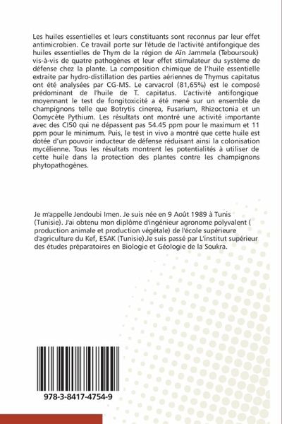 Les huiles essentielles et leurs constituants sont reconnus par leur effet antimicrobien. Ce travail porte sur l'étude de l'activité antifongique des huiles essentielles de Thym de la région de Aïn Jammela (Teboursouk) vis-à-vis de quatre pathogènes et leur effet stimulateur du système de défense chez la plante. La composition chimique de l'huile essentielle extraite par hydro-distillation des parties aériennes de Thymus capitatus ont été analysées par CG-MS. Le carvacrol (81,65%) est le composé prédominant de l'huile de T. capitatus. L'activité antifongique moyennant le test de fongitoxicité a été mené sur un ensemble de champignons telle que Botrytis cinerea, Fusarium, Rhizoctonia et un Oomycète Pythium. Les résultats ont montré une activité importante avec des CI50 qui ne dépassent pas 54.45 ppm pour le maximum et 11 ppm pour le minimum. Puis, le test in vivo a montré que cette huile est dotée d'un pouvoir inducteur de défense réduisant ainsi la colonisation mycélienne. Tous les résultats montrent les potentialités à utiliser de cette huile dans la protection des plantes contre les champignons phytopathogènes.