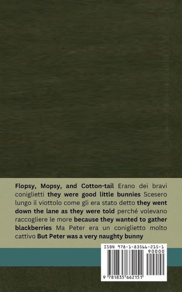 Ma Peter era un coniglietto molto cattivo But Peter was a very naughty bunny e corse dritto al giardino del signor McGregor and he ran straight to Mr. McGregor's garden e si infilò sotto il cancello! and he squeezed under the gate! Per prima cosa mangiò delle lattughe First he ate some lettuces poi mangiò dei fagiolini then he ate some French beans E poi mangiò dei ravanelli and then he ate some radishes