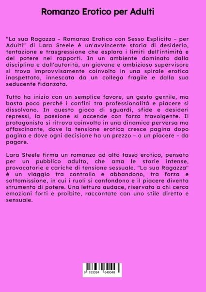 "La sua Ragazza - Romanzo Erotico con Sesso Esplicito - per Adulti" di Lara Steele è un'avvincente storia di desiderio, tentazione e trasgressione che esplora i limiti dell'intimità e del potere nei rapporti. In un ambiente dominato dalla disciplina e dall'autorità, un giovane e ambizioso supervisore si trova improvvisamente coinvolto in una spirale erotica inaspettata, innescata da un collega fragile e dalla sua seducente fidanzata.Tutto ha inizio con un semplice favore, un gesto gentile, ma basta poco perché i confini tra professionalità e piacere si dissolvano. In questo gioco di sguardi, sfide e desideri repressi, la passione si accende con forza travolgente. Il protagonista si ritrova coinvolto in una dinamica perversa ma affascinante, dove la tensione erotica cresce pagina dopo pagina e dove ogni decisione ha un prezzo - o un piacere - da pagare.Lara Steele firma un romanzo ad alto tasso erotico, pensato per un pubblico adulto, che ama le storie intense, provocatorie e cariche di tensione sessuale. "La sua Ragazza" è un viaggio tra controllo e abbandono, tra forza e sottomissione, in cui i ruoli si confondono e il piacere diventa strumento di potere. Una lettura audace, riservata a chi cerca emozioni forti e proibite, raccontate con uno stile diretto e sensuale.