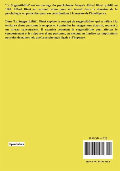 Dans "La Suggestibilité", Alfred Binet explore la capacité des individus à être influencés par des suggestions sans recourir à l'hypnotisme. L'auteur met en avant l'importance de dissocier l'étude de la suggestibilité de celle de l'hypnotisme, soulignant les inconvénients pratiques et éthiques de ce dernier. Binet propose des méthodes pédagogiques pour évaluer la suggestibilité, évolution chez les enfants, sans provoquer d'émotions ou de troubles. Il décrit des expériences menées dans des écoles, où des suggestions subtiles sont utilisées pour influencer les réponses des élèves, révélant ainsi des degrés variés de suggestibilité. L'étude montre que la suggestibilité diminue avec l'âge et que les enfants plus jeunes sont généralement plus influençables. Binet discute également de la relation entre la suggestibilité et l'intelligence, remettant en question l'idée que la suggestibilité est synonyme d'éducabilité. Il souligne l'importance de la personnalité de l'expérimentateur et de l'autorité morale dans le succès des suggestions. Par conséquent, Binet propose que la suggestibilité soit étudiée comme un phénomène distinct, avec ses propres mécanismes et implications, plutôt que d'être simplement associée à l'hypnotisme.