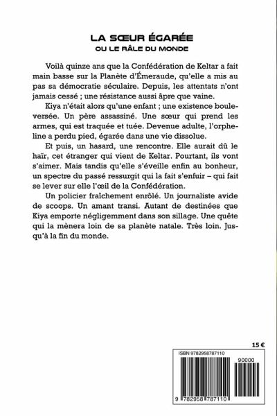 Voilà quinze ans que la Confédération de Keltar a fait main basse sur la Planète d'Émeraude, qu'elle a mis au pas sa démocratie séculaire. Depuis, les attentats n'ont jamais cessé; une résistance aussi âpre que vaine. Kiya n'était alors qu'une enfant; une existence bouleversée. Un père assassiné. Une soeur qui prend les armes, qui est traquée et tuée. Devenue adulte, l'orpheline a perdu pied, égarée dans une vie dissolue. Et puis, un hasard, une rencontre. Elle aurait dû le haïr, cet étranger qui vient de Keltar. Pourtant, ils vont s'aimer. Mais tandis qu'elle s'éveille enfin au bonheur, un spectre du passé ressurgit qui la fait s'enfuir - qui fait se lever sur elle l'oeil de la Confédération. Un policier fraîchement enrôlé. Un journaliste avide de scoops. Un amant transi. Autant de destinées que Kiya emporte négligemment dans son sillage. Une quête qui la mènera loin de sa planète natale. Très loin. Jusqu'à la fin du monde.