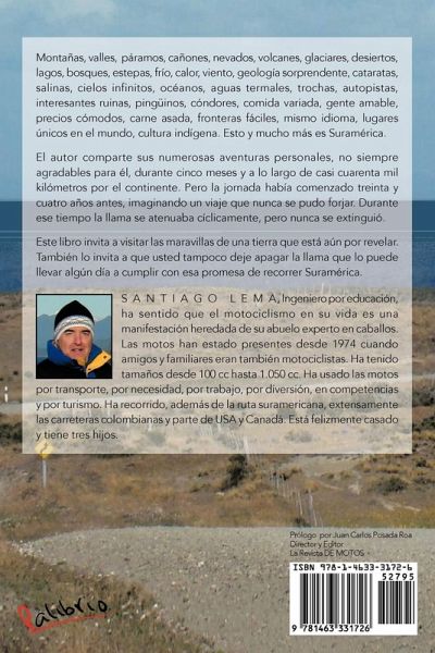 Montañas, valles, páramos, cañones, nevados, volcanes, glaciares, desiertos, lagos, bosques, estepas, frío, calor, viento, geología sorprendente, cataratas, salinas, cielos infinitos, océanos, aguas termales, trochas, autopistas, interesantes ruinas, pingüinos, cóndores, comida variada, gente amable, precios cómodos, carne asada, fronteras fáciles, mismo idioma, lugares únicos en el mundo, cultura indígena. Esto y mucho más es Suramérica. El autor comparte sus numerosas aventuras personales, no siempre agradables para él, durante cinco meses y a lo largo de casi cuarenta mil kilómetros por el continente. Pero la jornada había comenzado treinta y cuatro años antes, imaginando un viaje que nunca se pudo forjar. Durante ese tiempo la llama se atenuaba cíclicamente, pero nunca se extinguió. Este libro invita a visitar las maravillas de una tierra que está aún por revelar. También lo invita a que usted tampoco deje apagar la llama que lo puede llevar algún día a cumplir con esa promesa de recorrer Suramérica.