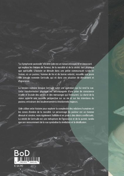 "La Symphonie pastorale" d'André Gide est un roman introspectif et émouvant qui explore les thèmes de l'amour, de la moralité et de la cécité, tant physique que spirituelle. L'histoire se déroule dans une petite communauté rurale en Suisse, où un pasteur, homme de foi et de bonne volonté, recueille une jeune fille aveugle nommée Gertrude, qui vit dans une situation de dénuement et d'ignorance.La tension culmine lorsque Gertrude subit une opération qui lui rend la vue. Cette transformation physique est accompagnée d'une prise de conscience cruelle et brutale des vérités et des mensonges qui l'entourent. La clarté de la vision apporte une nouvelle perspective sur sa vie et sur les intentions du pasteur, entraînant des bouleversements émotionnels majeurs.Gide utilise cette histoire pour explorer la complexité des relations humaines et les zones d'ombre de la moralité. Le personnage du pasteur est un homme dévoué et sincère, mais également faillible et en proie à des désirs conflictuels. La cécité de Gertrude est une métaphore de l'ignorance et de la pureté, tandis que son recouvrement de la vue symbolise la révélation et la désillusion.