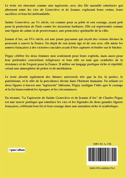Le texte est structuré comme une tapisserie, avec des fils narratifs entrelacés qui alternent entre les vies de Geneviève et de Jeanne, explorant leurs vertus, leurs sacrifices et leur foi inébranlable. Sainte Geneviève, au Ve siècle, est connue pour sa piété et son courage, ayant prié pour la protection de Paris contre les invasions barbares. Elle est représentée comme une figure de calme et de persévérance, une protectrice spirituelle de la ville. Jeanne d¿Arc, au XVe siècle, est une jeune paysanne qui reçoit des visions divines la poussant à sauver la France. En dépit de son jeune âge et de son sexe, elle mène les armées françaises à des victoires cruciales avant d¿être capturée et brûlée sur le bûcher. Péguy célèbre les deux femmes non seulement pour leurs exploits, mais aussi pour leur profondes convictions religieuses et leur rôle en tant que symboles de la résistance et de l'espoir pour la France. Il utilise un langage poétique riche et répétitif, créant une atmosphère de prière et de méditation. Le texte aborde également des thèmes universels tels que la foi, la justice, le patriotisme, et le rôle de la providence divine dans l'histoire humaine. En reliant ces deux figures à travers une "tapisserie" littéraire, Péguy souligne l¿idée que le courage et la foi transcendent les époques et les circonstances. En résumé, "La Tapisserie de Sainte Geneviève et de Jeanne d¿Arc" de Charles Péguy est une ¿uvre poétique qui entrelace les vies et les légendes de deux grandes figures françaises, célébrant leur foi et leur courage dans une narration riche et symbolique.