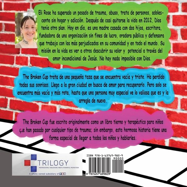 The Broken Cup trata de una pequeña taza que se encuentra vacía y triste. Ha perdido todas sus sonrisas. Llega a la gran ciudad en busca de amor para recuperarlo. Pero solo se encuentra más vacía y más rota, hasta que una persona muy especial ve lo valiosa que es y la arregla de nuevo. The Broken Cup fue escrito originalmente como un libro tierno y terapéutico para niños que han pasado por cualquier tipo de trauma; sin embargo, esta hermosa historia tiene una forma especial de llegar a todos los nińos y hablarles.
