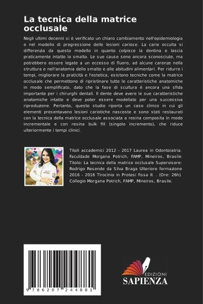 Negli ultimi decenni si è verificato un chiaro cambiamento nell'epidemiologia e nel modello di progressione delle lesioni cariose. La carie occulta si differenzia da questo modello in quanto colpisce la dentina e lascia praticamente intatto lo smalto. Le sue cause sono ancora sconosciute, ma potrebbero essere legate a un eccesso di fluoro, ad alcune carenze nella struttura e nell'anatomia dello smalto e alle abitudini alimentari. Per ridurre i tempi, migliorare la praticità e l'estetica, esistono tecniche come la matrice occlusale che permettono di ripristinare tutte le caratteristiche anatomiche in modo semplificato, dato che la fase di scultura è ancora una sfida importante per i chirurghi dentali. Il dente deve avere le sue caratteristiche anatomiche intatte e deve poter essere modellato per una successiva riproduzione. Pertanto, questo studio riporta un caso clinico in cui gli elementi presentavano lesioni cariotiche nascoste e sono stati restaurati con la tecnica della matrice occlusale associata a resina composita in modo incrementale e con resina bulk fill (singolo incremento), che riduce ulteriormente i tempi clinici.