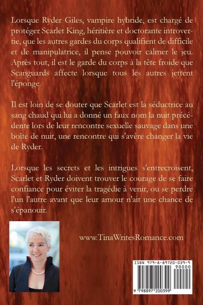 Lorsque Ryder Giles, vampire hybride, est chargé de protéger Scarlet King, héritière et doctorante introvertie, que les autres gardes du corps qualifient de difficile et de manipulatrice, il pense pouvoir calmer le jeu. Après tout, il est le garde du corps à la tête froide que Scanguards affecte lorsque tous les autres jettent l'éponge. Il est loin de se douter que Scarlet est la séductrice au sang chaud qui lui a donné un faux nom la nuit précédente lors de leur rencontre sexuelle sauvage dans une boîte de nuit, une rencontre qui s'avère changer la vie de Ryder. Lorsque les secrets et les intrigues s'entrecroisent, Scarlet et Ryder doivent trouver le courage de se faire confiance pour éviter la tragédie à venir, ou se perdre l'un l'autre avant que leur amour n'ait une chance de s'épanouir. Les Vampires Scanguards: Tome 1 - La belle mortelle de Samson Tome 2 - La provocatrice d'Amaury Tome 3 - La partenaire de Gabriel Tome 4 - L'enchantement d'Yvette Tome 5 - La rédemption de Zane Tome 6 - L'éternel amour de Quinn Tome 7 - Les désirs d'Oliver Tome 8 - Le choix de Thomas Tome 8 1/2 - Discrète morsure Tome 9 - L'identité de Cain Tome 10 - Le retour de Luther Une nouvelle: Ardent désir Tome 11 - La promesse de Blake Tome 11 ¿ - Fatidiques retrouvailles Tome 12 - L'espoir de John La tempête de Ryder (#13) La conquête de Damian (#14) Le défi de Grayson (#15) L'amour interdit d'Isabelle (#16) La passion de Cooper (#17) Le courage de Vanessa (#18) La séduction de Patrick (#19) Ardent désir (Nouvelle) Les Gardiens de la Nuit Amant Révélé (#1) Maître Affranchi (#2) Guerrier Bouleversé (#3) Gardien Rebelle (#4) Immortel Dévoilé (#5) Protecteur Sans Égal (#6) Démon Libéré (#7) Autres séries : Les Vampires de Venise Hors d'Olympe Nom de Code Stargate La Quête du Temps Le club des éternels célibataires Thriller : Témoin Oculaire