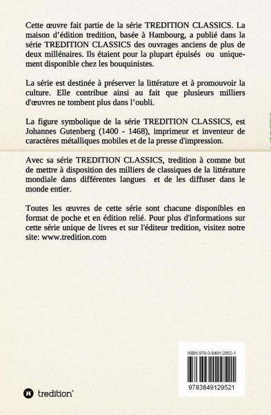 Cette uvre fait partie de la série TREDITION CLASSICS. La maison d édition tredition, basée à Hambourg, a publié dans la série TREDITION CLASSICS des ouvrages anciens de plus de deux millénaires. Ils étaient pour la plupart épuisés ou unique-ment disponible chez les bouquinistes. La série est destinée à préserver la littérature et à promouvoir la culture. Avec sa série TREDITION CLASSICS, tredition à comme but de mettre à disposition des milliers de classiques de la littérature mondiale dans différentes langues et de les diffuser dans le monde entier.