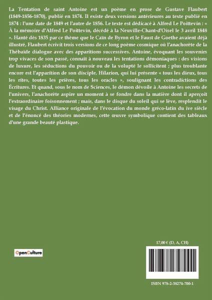La Tentation de saint Antoine est un poème en prose de Gustave Flaubert (1849-1856-1870), publié en 1874. Il existe deux versions antérieures au texte publié en 1874 : l'une date de 1849 et l'autre de 1856. Le texte est dédicacé à Alfred Le Poittevin : « À la mémoire d'Alfred Le Poittevin, décédé à la Neuville-Chant-d'Oisel le 3 avril 1848 ». Hanté dès 1835 par ce thème que le Caïn de Byron et le Faust de Goethe avaient déjà illustré, Flaubert écrivit trois versions de ce long poème cosmique où l'anachorète de la Thébaïde dialogue avec des apparitions successives. Antoine, évoquant les souvenirs trop vivaces de son passé, connaît à nouveau les tentations démoniaques : des visions de luxure, les séductions du pouvoir ou de la volupté le sollicitent ; plus troublante encore est l'apparition de son disciple, Hilarion, qui lui présente « tous les dieux, tous les rites, toutes les prières, tous les oracles », soulignant les contradictions des Écritures. Et quand, sous le nom de Sciences, le démon dévoile à Antoine les secrets de l'univers, l'anachorète aspire un moment à se fondre dans la matière dont il aperçoit l'extraordinaire foisonnement ; mais, dans le disque du soleil qui se lève, resplendit le visage du Christ. Alliance originale de l'évocation du monde gréco-latin du ive siècle et de l'énoncé des théories modernes, cette ¿uvre symbolique contient des tableaux d'une grande beauté plastique.