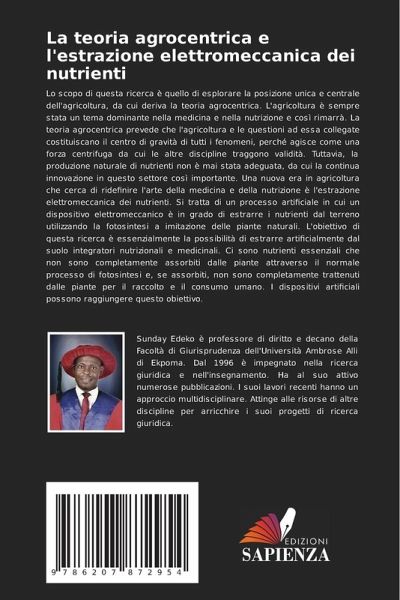 Lo scopo di questa ricerca è quello di esplorare la posizione unica e centrale dell'agricoltura, da cui deriva la teoria agrocentrica. L'agricoltura è sempre stata un tema dominante nella medicina e nella nutrizione e così rimarrà. La teoria agrocentrica prevede che l'agricoltura e le questioni ad essa collegate costituiscano il centro di gravità di tutti i fenomeni, perché agisce come una forza centrifuga da cui le altre discipline traggono validità. Tuttavia, la produzione naturale di nutrienti non è mai stata adeguata, da cui la continua innovazione in questo settore così importante. Una nuova era in agricoltura che cerca di ridefinire l'arte della medicina e della nutrizione è l'estrazione elettromeccanica dei nutrienti. Si tratta di un processo artificiale in cui un dispositivo elettromeccanico è in grado di estrarre i nutrienti dal terreno utilizzando la fotosintesi a imitazione delle piante naturali. L'obiettivo di questa ricerca è essenzialmente la possibilità di estrarre artificialmente dal suolo integratori nutrizionali e medicinali. Ci sono nutrienti essenziali che non sono completamente assorbiti dalle piante attraverso il normale processo di fotosintesi e, se assorbiti, non sono completamente trattenuti dalle piante per il raccolto e il consumo umano. I dispositivi artificiali possono raggiungere questo obiettivo.