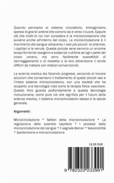 Quando pensiamo al sistema circolatorio, immaginiamo spesso le grandi arterie che corrono da e verso il cuore. Eppure ciò che molti di noi non considera è la microcircolazione che avviene anche all'interno del corpo. La microcircolazione è il movimento del sangue attraverso i vasi più piccoli: le arteriole, i capillari e le venule. Queste piccole vene servono un enorme scopo fornendo ossigeno e sostanze nutritive ad ogni parte del corpo umano, ma sono facilmente suscettibili di danneggiamento o di malattia e la loro dimensione li rende difficili da trattare con metodi convenzionali. La scienza medica sta facendo progressi, cercando di trovare soluzioni che consentano il trattamento di questi piccoli vasi e l'intero sistema microcircolatorio, con una società che ha scoperto una tecnologia nota come la terapia fisica vascolare. Questo libro guarda profondamente a questa tecnologia rivoluzionaria, come pure ciò che significa per il futuro della scienza medica, il sistema microcircolatorio stesso e la salute generale. Argomenti: Microcircolazione * Settori della microcircolazione * La regolazione dello scambio capillare * I processi della microcircolazione del sangue * Il segnale Bemer * Vasomotilità * Ipertensione e microcircolazione