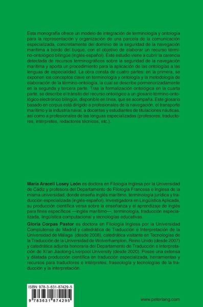 Esta monografía ofrece un modelo de integración de terminología y ontología para la representación y organización de una parcela de la comunicación especializada, concretamente del dominio de la seguridad de la navegación marítima a bordo del buque, con el objetivo de elaborar un recurso término-ontológico bilingüe (inglés-español). Este estudio viene a cubrir la carencia detectada de recursos terminográficos sobre la seguridad de la navegación marítima y aporta un procedimiento para la aplicación de las ontologías a las lenguas de especialidad. La obra consta de cuatro partes: en la primera, se exponen los conceptos clave en terminología y ontología y la metodología de elaboración de la término-ontología, la cual se describe pormenorizadamente en la segunda y tercera parte. Tras la formalización ontológica en la cuarta parte, se describe el tránsito del recurso ontológico a un glosario término-ontológico electrónico bilingüe, disponible en línea, que se acompaña. Este glosario basado en corpus está dirigido a profesionales de la navegación, el transporte marítimo y la industria naval, a docentes y estudiantes de titulaciones náuticas, así como a profesionales de las lenguas especializadas (profesores, traductores, intérpretes, redactores técnicos, etc.).
