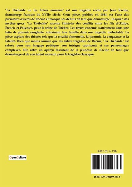 "La Thébaïde ou les Frères ennemis" est une tragédie écrite par Jean Racine, dramaturge français du XVIIe siècle. Cette pièce, publiée en 1664, est l'une des premières ¿uvres de Racine et marque ses débuts en tant que dramaturge. Inspirée des mythes grecs, "La Thébaïde" raconte l'histoire des conflits entre les fils d'¿dipe, Étéocle et Polynice, pour le trône de Thèbes. Les frères ennemis s'affrontent dans une lutte de pouvoir sanglante, entraînant leur famille dans une tragédie inéluctable. La pièce explore des thèmes tels que la rivalité fraternelle, la tyrannie, la vengeance et la fatalité. Bien que moins connue que les autres tragédies de Racine, "La Thébaïde" est saluée pour son langage poétique, son intrigue captivante et ses personnages complexes. Elle offre un aperçu fascinant de la jeunesse de Racine en tant que dramaturge et de son talent naissant pour la tragédie classique.