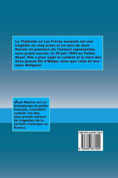 La Thébaïde ou Les Frères ennemis est une tragédie en cinq actes et en vers de Jean Racine (la première de l'auteur) représentée, sans grand succès, le 20 juin 1664 au Palais-Royal. Elle a pour sujet le combat et la mort des deux jeunes fils d'¿dipe, ainsi que celle de leur s¿ur Antigone.
