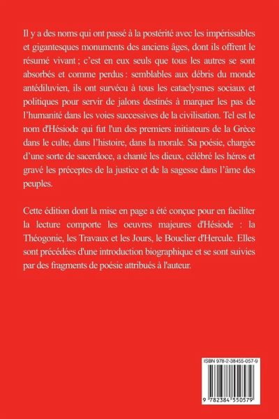 Il y a des noms qui ont passé à la postérité avec les impérissables et gigantesques monuments des anciens âges, dont ils offrent le résumé vivant ; c'est en eux seuls que tous les autres se sont absorbés et comme perdus : semblables aux débris du monde antédiluvien, ils ont survécu à tous les cataclysmes sociaux et politiques pour servir de jalons destinés à marquer les pas de l'humanité dans les voies successives de la civilisation. Tel est le nom d'Hésiode qui fut l'un des premiers initiateurs de la Grèce dans le culte, dans l'histoire, dans la morale. Sa poésie, chargée d'une sorte de sacerdoce, a chanté les dieux, célébré les héros et gravé les préceptes de la justice et de la sagesse dans l'âme des peuples. Cette édition dont la mise en page a été conçue pour en faciliter la lecture comporte les oeuvres majeures d'Hésiode : la Théogonie, les Travaux et les Jours, le Bouclier d'Hercule. Elles sont précédées d'une introduction biographique et se sont suivies par des fragments de poésie attribués à l'auteur.