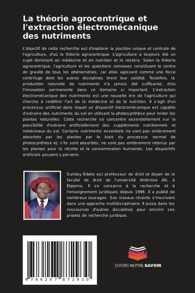 L'objectif de cette recherche est d'explorer la position unique et centrale de l'agriculture, d'où la théorie agrocentrique. L'agriculture a toujours été un sujet dominant en médecine et en nutrition et le restera. Selon la théorie agrocentrique, l'agriculture et les questions connexes constituent le centre de gravité de tous les phénomènes, car elles agissent comme une force centrifuge dont les autres disciplines tirent leur validité. Toutefois, la production naturelle de nutriments n'a jamais été suffisante, d'où l'innovation permanente dans ce domaine si important. L'extraction électromécanique des nutriments est une nouvelle ère de l'agriculture qui cherche à redéfinir l'art de la médecine et de la nutrition. Il s'agit d'un processus artificiel dans lequel un dispositif électromécanique est capable d'extraire des nutriments du sol en utilisant la photosynthèse pour imiter les plantes naturelles. Cette recherche se concentre essentiellement sur la possibilité d'extraire artificiellement des suppléments nutritionnels et médicinaux du sol. Certains nutriments essentiels ne sont pas entièrement absorbés par les plantes par le biais du processus normal de photosynthèse et, s'ils sont absorbés, ne sont pas entièrement retenus par les plantes pour la récolte et la consommation humaines. Les dispositifs artificiels peuvent y parvenir.