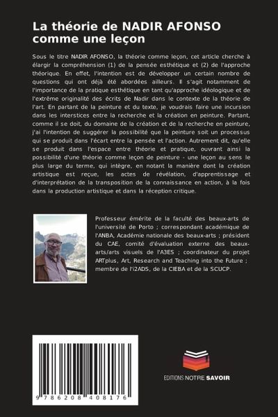 Sous le titre NADIR AFONSO, la théorie comme leçon, cet article cherche à élargir la compréhension (1) de la pensée esthétique et (2) de l'approche théorique. En effet, l'intention est de développer un certain nombre de questions qui ont déjà été abordées ailleurs. Il s'agit notamment de l'importance de la pratique esthétique en tant qu'approche idéologique et de l'extrême originalité des écrits de Nadir dans le contexte de la théorie de l'art. En partant de la peinture et du texte, je voudrais faire une incursion dans les interstices entre la recherche et la création en peinture. Partant, comme il se doit, du domaine de la création et de la recherche en peinture, j'ai l'intention de suggérer la possibilité que la peinture soit un processus qui se produit dans l'écart entre la pensée et l'action. Autrement dit, qu'elle se produit dans l'espace entre théorie et pratique, ouvrant ainsi la possibilité d'une théorie comme leçon de peinture - une leçon au sens le plus large du terme, qui intègre, en notant la manière dont la création artistique est reçue, les actes de révélation, d'apprentissage et d'interprétation de la transposition de la connaissance en action, à la fois dans la production artistique et dans la réception critique.