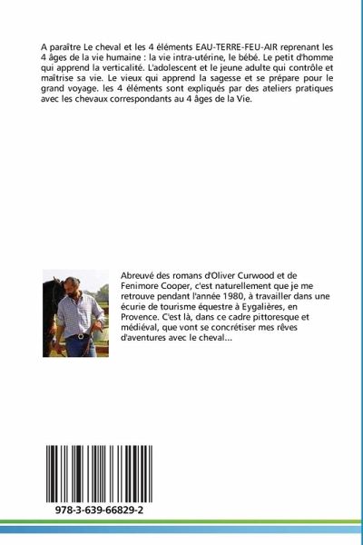 A paraître Le cheval et les 4 éléments EAU-TERRE-FEU-AIR reprenant les 4 âges de la vie humaine : la vie intra-utérine, le bébé. Le petit d'homme qui apprend la verticalité. L'adolescent et le jeune adulte qui contrôle et maîtrise sa vie. Le vieux qui apprend la sagesse et se prépare pour le grand voyage. les 4 éléments sont expliqués par des ateliers pratiques avec les chevaux correspondants au 4 âges de la Vie.