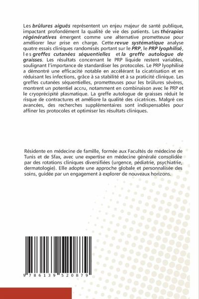Les brûlures aiguës représentent un enjeu majeur de santé publique, impactant profondément la qualité de vie des patients. Les thérapies régénératives émergent comme une alternative prometteuse pour améliorer leur prise en charge. Cette revue systématique analyse quatre essais cliniques randomisés portant sur le PRP, le PRP lyophilisé, les greffes cutanées séquentielles et la greffe autologue de graisses. Les résultats concernant le PRP liquide restent variables, soulignant l'importance de standardiser les protocoles. Le PRP lyophilisé a démontré une efficacité notable en accélérant la cicatrisation et en réduisant les infections, grâce à sa stabilité et à sa praticité clinique. Les greffes cutanées séquentielles, prometteuses pour les brûlures sévères, montrent un potentiel accru, notamment en combinaison avec le PRP et le cryoprécipité plasmatique. La greffe autologue de graisses réduit le risque de contractures et améliore la qualité des cicatrices. Malgré ces avancées, des recherches supplémentaires sont indispensables pour affiner les protocoles et optimiser les résultats cliniques.
