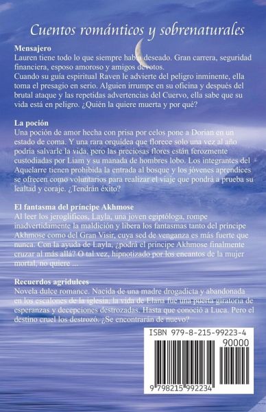 La tierra de la fantasía: Cuentos románticos y sobrenaturales Mensajero Lauren tiene todo lo que siempre había deseado. Gran carrera, seguridad financiera, esposo amoroso y amigos devotos. Cuando su guía espiritual Raven le advierte del peligro inminente, ella toma el presagio en serio. Alguien irrumpe en su oficina y después del brutal ataque y las repetidas advertencias del Cuervo, ella sabe que su vida está en peligro. ¿Quién la quiere muerta y por qué? La poción Una poción de amor hecha con prisa por celos pone a Dorian en un estado de coma. Y una rara orquídea que florece solo una vez al año podría salvarle la vida, pero las preciosas flores están ferozmente custodiadas por Liam y su manada de hombres lobo. Los integrantes del Aquelarre tienen prohibida la entrada al bosque y los jóvenes aprendices se ofrecen como voluntarios para realizar el viaje que pondrá a prueba su lealtad y coraje. ¿Tendrán éxito? El fantasma del príncipe Akhmose Al leer los jeroglíficos, Layla, una joven egiptóloga, rompe inadvertidamente la maldición y libera los fantasmas tanto del príncipe Akhmose como del Gran Visir, cuya sed de venganza es más fuerte que nunca. Con la ayuda de Layla, ¿podrá el príncipe Akhmose finalmente cruzar al más allá? O tal vez, hipnotizado por los encantos de la mujer mortal, no quiere ... Recuerdos agridulces Novela dulce romance. Nacida de una madre drogadicta y abandonada en los escalones de la iglesia, la vida de Elana fue una puerta giratoria de esperanzas y decepciones destrozadas. Hasta que conoció a Luca. Pero el destino cruel los destrozó. ¿Se encontrarán de nuevo?