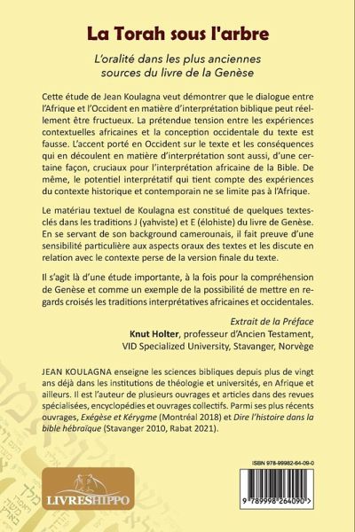 Cette étude de Jean Koulagna veut démontrer que le dialogue entre l'Afrique et l'Occident en matière d'interprétation biblique peut réellement être fructueux. La prétendue tension entre les expériences contextuelles africaines et la conception occidentale du texte est fausse. L'accent porté en Occident sur le texte et les conséquences qui en découlent en matière d'interprétation sont aussi, d'une certaine façon, cruciaux pour l'interprétation africaine de la Bible. De même, le potentiel interprétatif qui tient compte des expériences du contexte historique et contemporain ne se limite pas à l'Afrique. Le matériau textuel de Koulagna est constitué de quelques textes-clés dans les traditions J (yahviste) et E (élohiste) du livre de Genèse. En se servant de son background camerounais, il fait preuve d'une sensibilité particulière aux aspects oraux des textes et les discute en relation avec le contexte perse de la version finale du texte. Il s'agit là d'une étude importante, à la fois pour la compréhension de Genèse et comme un exemple de la possibilité de mettre en regards croisés les traditions interprétatives africaines et occidentales.