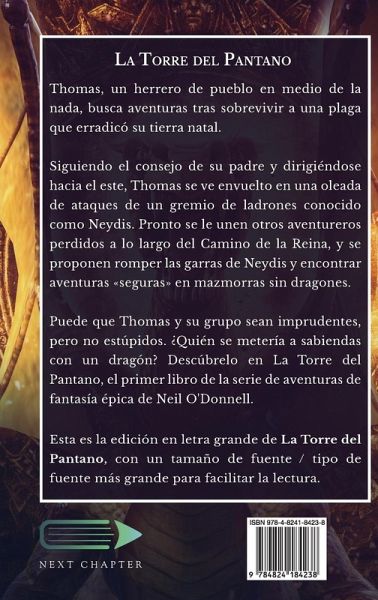 Thomas, un herrero de pueblo en medio de la nada, busca aventuras tras sobrevivir a una plaga que erradicó su tierra natal. Siguiendo el consejo de su padre y dirigiéndose hacia el este, Thomas se ve envuelto en una oleada de ataques de un gremio de ladrones conocido como Neydis. Pronto se le unen otros aventureros perdidos a lo largo del Camino de la Reina, y se proponen romper las garras de Neydis y encontrar aventuras seguras en mazmorras sin dragones. Puede que Thomas y su grupo sean imprudentes, pero no estúpidos. ¿Quién se metería a sabiendas con un dragón? Descúbrelo en La Torre del Pantano, el primer libro de la serie de aventuras de fantasía épica de Neil O'Donnell. Esta es la edición en letra grande de La Torre del Pantano, con un tamaño de fuente / tipo de fuente más grande para facilitar la lectura.