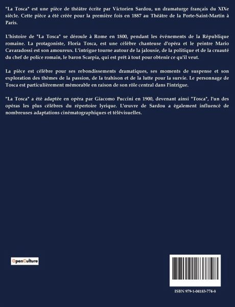 "La Tosca" est une pièce de théâtre écrite par Victorien Sardou, un dramaturge français du XIXe siècle. Cette pièce a été créée pour la première fois en 1887 au Théâtre de la Porte-Saint-Martin à Paris. L'histoire de "La Tosca" se déroule à Rome en 1800, pendant les événements de la République romaine. La protagoniste, Floria Tosca, est une célèbre chanteuse d'opéra et le peintre Mario Cavaradossi est son amoureux. L'intrigue tourne autour de la jalousie, de la politique et de la cruauté du chef de police romain, le baron Scarpia, qui est prêt à tout pour obtenir ce qu'il veut. La pièce est célèbre pour ses rebondissements dramatiques, ses moments de suspense et son exploration des thèmes de la passion, de la trahison et de la lutte pour la survie. Le personnage de Tosca est particulièrement mémorable en raison de son rôle central dans l'intrigue. "La Tosca" a été adaptée en opéra par Giacomo Puccini en 1900, devenant ainsi "Tosca", l'un des opéras les plus célèbres du répertoire lyrique. L'¿uvre de Sardou a également influencé de nombreuses adaptations cinématographiques et télévisuelles.