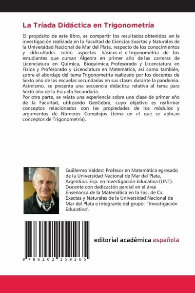 El propósito de este libro, es compartir los resultados obtenidos en la investigación realizada en la Facultad de Ciencias Exactas y Naturales de la Universidad Nacional de Mar del Plata, respecto de los conocimientos y dificultades sobre aspectos básicos de Trigonometría de los estudiantes que cursan Álgebra en primer año de las carreras de Licenciatura en Química, Bioquímica, Profesorado y Licenciatura en Física y Profesorado y Licenciatura en Matemática, así como también, sobre el abordaje del tema Trigonometría realizado por los docentes de Sexto año de las escuelas secundarias en sus clases durante la pandemia. Asimismo, se presenta una secuencia didáctica relativa al tema para Sexto año de la Escuela Secundaria.Por otra parte, se relata una experiencia sobre una clase de primer año de la Facultad, utilizando GeoGebra, cuyo objetivo es reafirmar conceptos relacionados con las propiedades de los módulos y argumentos de Números Complejos (tema en el que se aplican conceptos de Trigonometría).