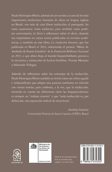 Paulo Henriques Britto, adem s de ser escritor, es uno de los m s importantes traductores literarios de obras en lengua inglesa en Brasil, con m s de cien libros traducidos al portugu s. Su vasta experiencia como traductor, pero tambi n como profesor universitario, lo llev a reflexionar sobre el oficio, dejando sus impresiones en varios textos publicados en revistas acad micas, y tambi n en este libro, La traducci n literaria, que fue publicado en Brasil el 2012, obteniendo el premio M rio de Andrade de Ensaio Liter rio, de la Fundaci n Biblioteca Nacional, en 2013, y que ahora llega al mundo hispanohablante gracias a la iniciativa y traducci n de Let cia Goellner, Vicente Menares y Sebasti n Villagra. Adem s de reflexionar sobre los entresijos de la traducci n, Paulo Henriques Britto tambi n se revela como un cr tico agudo e independiente que adopta una postura aut noma en relaci n con ciertas teor as, pero confirma, a la vez, que la traducci n, teniendo en cuenta las diferencias entre las lenguas/culturas, es siempre un trabajo creativo y que toda traducci n es, por definici n, una operaci n radical de reescritura . Andr ia Guerini, Universidad Federal de Santa Catarina (UFSC), Brasil.