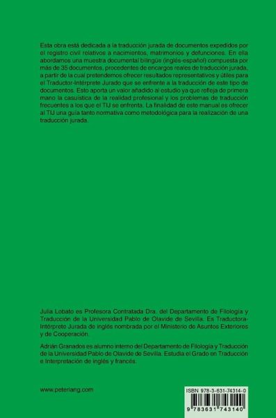 Esta obra está dedicada a la traducción jurada de documentos expedidos por el registro civil relativos a nacimientos, matrimonios y defunciones. En ella abordamos una muestra documental bilingüe (inglés-español) compuesta por más de 35 documentos, procedentes de encargos reales de traducción jurada, a partir de la cual pretendemos ofrecer resultados representativos y útiles para el Traductor-Intérprete Jurado que se enfrente a la traducción de este tipo de documentos. Esto aporta un valor añadido al estudio ya que refleja de primera mano la casuística de la realidad profesional y los problemas de traducción frecuentes a los que el TIJ se enfrenta. La finalidad de este manual es ofrecer al TIJ una guía tanto normativa como metodológica para la realización de una traducción jurada.