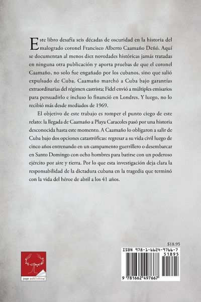 Este libro desafia seis decadas de oscuridad en la historia del malogrado coronel Francisco Alberto Caamano Deno. Aqui se documentan al menos diez novedades historicas jamas tratadas en ninguna otra publicacion y aporta pruebas de que el coronel Caamano, no solo fue enganado por los cubanos, sino que salio expulsado de Cuba. Caamano marcho a Cuba bajo garantias extraordinarias del regimen castrista; Fidel envio a multiples emisarios para persuadirlo e incluso lo financio en Londres. Y luego, no lo recibio mas desde mediados de 1969. El objetivo de este trabajo es romper el punto ciego de este relato: la llegada de Caamano a Playa Caracoles paso por una historia desconocida hasta este momento. A Caamano lo obligaron a salir de Cuba bajo dos opciones catastroficas: regresar a su vida civil luego de cinco anos entrenando en un campamento guerrillero o desembarcar en Santo Domingo con ocho hombres para batirse con un poderoso ejercito por aire y tierra. Por lo que esta investigacion deja clara la responsabilidad de la dictadura cubana en la tragedia que termino con la vida del heroe de abril a los 41 anos.