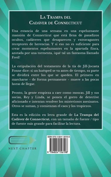 Una estancia de una semana en una espeluznante mansión de Connecticut que está llena de pasadizos ocultos, cadáveres que desaparecen y extravagantes receptores de herencias. Y si eso no es suficiente para crear momentos espeluznantes en la apartada finca, azotada por una tormenta, ¿qué tal un fantasma llamado Fred? La estipulación del testamento de la tía de Jill-Jocasta Fonne dice: si un huésped se va antes de tiempo, su parte se dividirá entre los que se queden. El primero en marcharse - de forma permanente - muere a las pocas horas de llegar. Pronto, la gente empieza a caer como moscas. Jill y sus socias, Rey y Linda, se ponen el gorro de detective aficionado e intentan resolver los misteriosos asesinatos. Otros se suman, y comienzan el caos y los tropiezos. Edición de Letra Grande