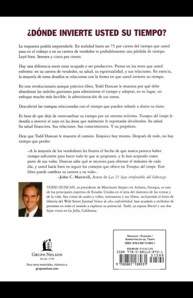 La productividad ha sido una palabra muy importante en el mundo de los negocios por varios ä¿os. Pero a pesar de nuestros mejores intentos y los innumerables libros de motivaci¿¿n, todav¿¿a nos retrasamos, trabajamos hasta tarde, balanceamos nuestros horarios y nos hundimos en nuestros negocios.Trampas del tiempo habla de los errores m¿¿s comunes que tenemos acerca del tiempo y del uso que le damos en nuestros trabajos. Duncan ha encontrado remedios comprobados para esos problemas universales con el tiempo, y ¿¿l muestra a los lectores como establecer un horario que funcione, no solo unos d¿¿as, sino todo el tiempo. Con los principios de Trampas del tiempo, los ejecutivos de ventas notar¿¿n un crecimiento en sus ventas al mismo tiempo que experimentan una disminuci¿¿n en sus horas de trabajo.